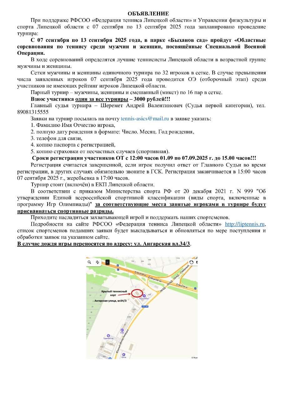 С 7 по 13 сентября 2025 года в парке «Быханов сад» (г. Липецк) пройдут Областные соревнования по теннису среди мужчин и женщин, посвящённые героям Специальной военной операции. Турнир проводится при поддержке РФСОО «Федерация тенниса Липецкой области» и Управления физкультуры и спорта Липецкой области.